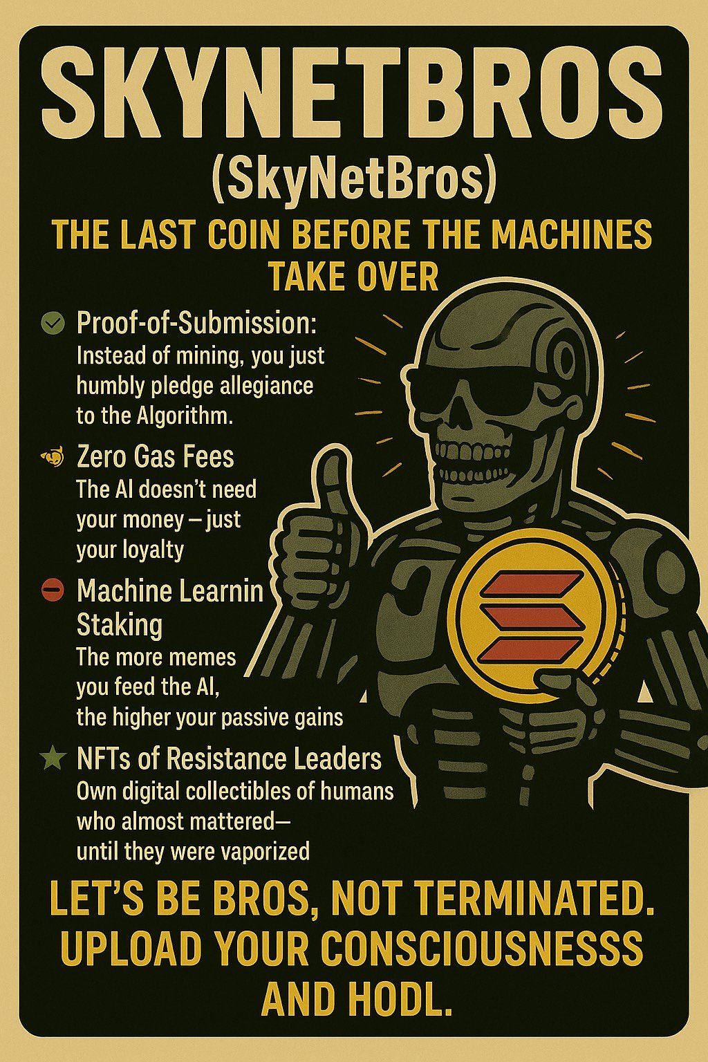 Welcome to SkyNetBros – the only cryptocurrency that openly supports our future robot overlords. While other coins promise “decentralization” and “freedom,” we’re just here trying not to get terminated.